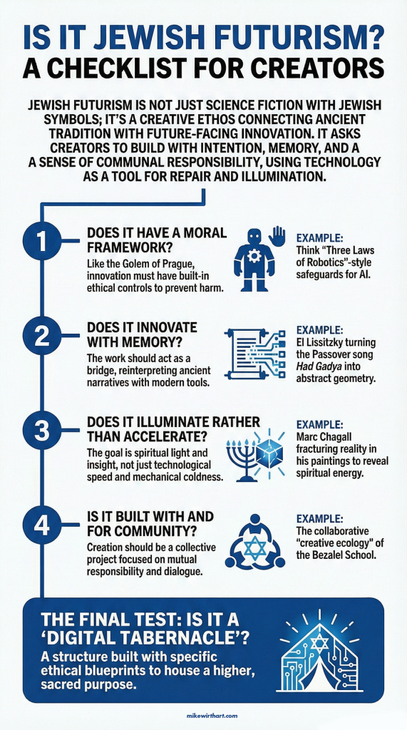 Jewish futurism offers that alternative model: technological optimism rooted in ancestral wisdom, innovation guided by empathy, futures built through synthesis rather than destruction. We can honor what we’ve inherited while transforming it. We can be critical of traditions that harm while keeping what sustains. We can build futures that acknowledge the past without being imprisoned by it.